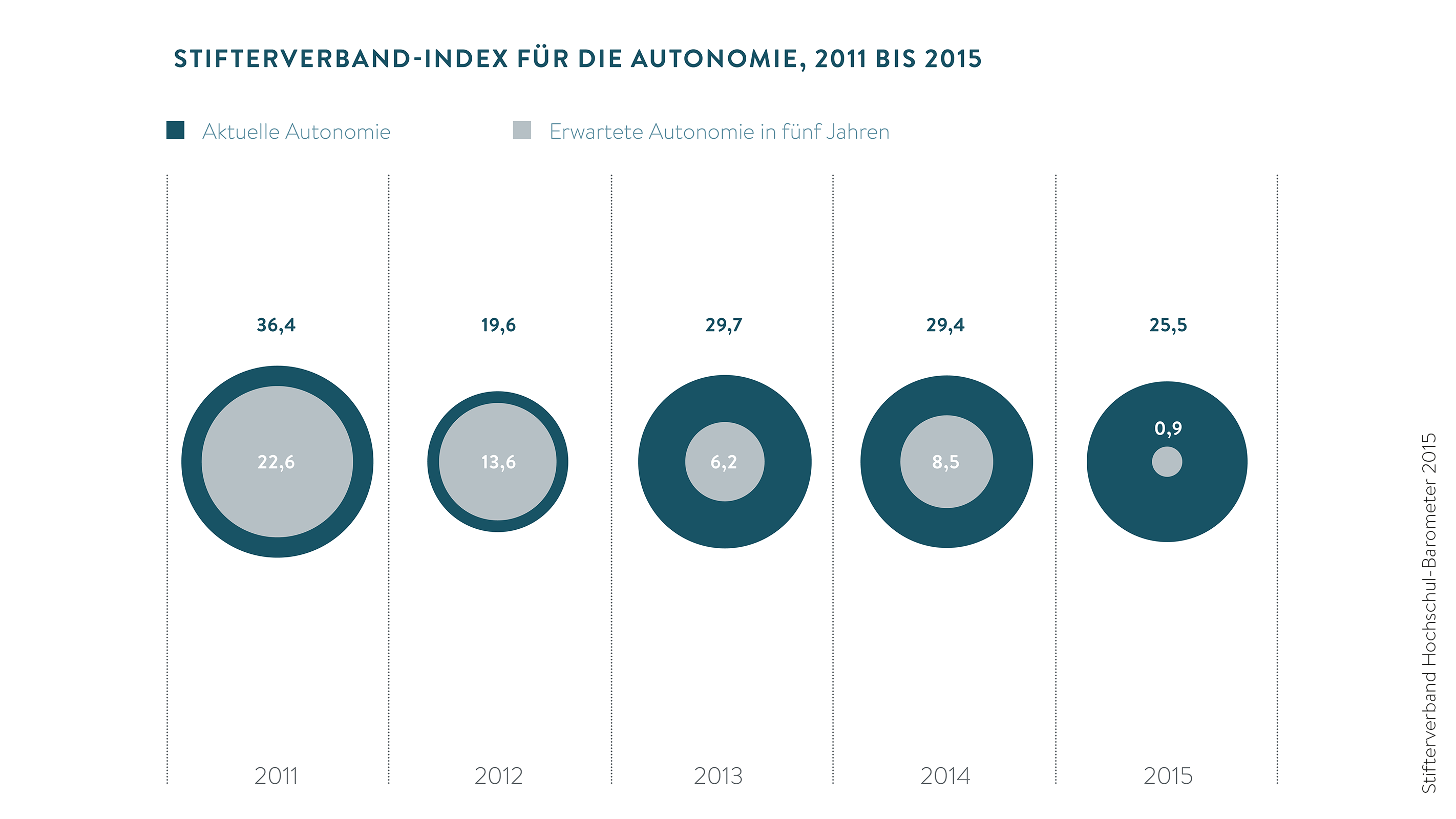 Immer mehr Hochschulleiter glauben, dass die Entscheidungsspielräume ihrer Einrichtung in Zukunft enger werden. Das zeigt der entsprechende Index, der im Jahr 2015 auf fast null Punkte gefallen ist. Damit ist die Einschätzung zur zukünftigen Autonomie der am schlechtesten bewertete Indikator zur Entwicklung der Hochschulen in den nächsten fünf Jahren. Die aktuelle Lage wird hingegen noch als hinreichend gut wahrgenommen, der Rückgang seit dem Jahr 2011 ist moderat.