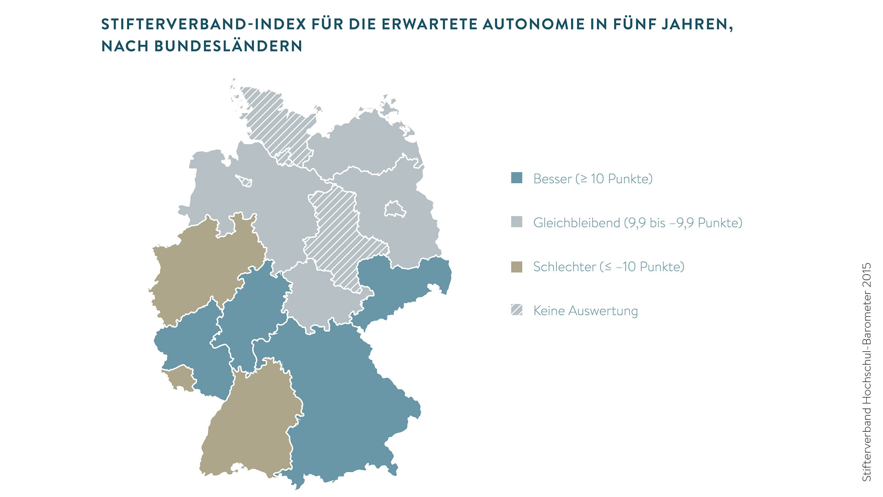 Bundesweit sehen die Rektoren und Präsidenten die Entwicklung der Hochschulautonomie skeptisch. Doch es gibt Unterschiede nach Bundesländern. Obwohl die entsprechenden Landeshochschulgesetze bereits angepasst wurden, befürchten die Hochschulen in Baden-Württemberg und Nordrhein-Westfalen weitere Einschnitte in ihrer Autonomie. Das gilt auch für das Saarland. Mehr Freiheiten in Zukunft erhoffen sich dagegen die Rektoren und Präsidenten in Bayern, Hessen, Sachsen und vor allem Rheinland-Pfalz.