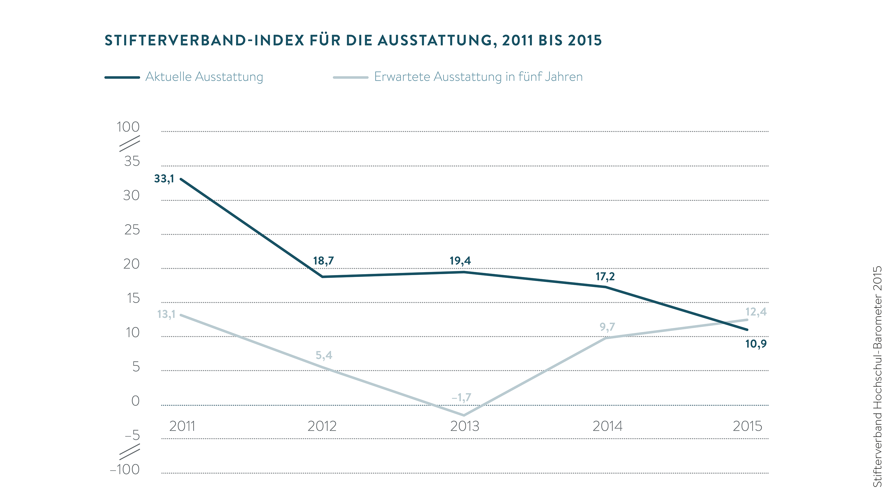 Deutschlands Hochschulleiter sehen einen schleichenden Verfall der infrastrukturellen Ausstattung ihrer Hochschule. Kein anderer Indikator hat sich in den vergangenen fünf Jahren so schlecht entwickelt wie die Bewertung der aktuellen Ausstattung der Hochschule, etwa bei Gebäuden, Laboren und Bibliotheken. Seit zwei Jahren steigt jedoch der Indikator, der die Erwartung zur Ausstattung in fünf Jahren misst. Es gibt also an den Hochschulen die leichte Hoffnung auf zukünftige Investitionen in die Infrastruktur.
