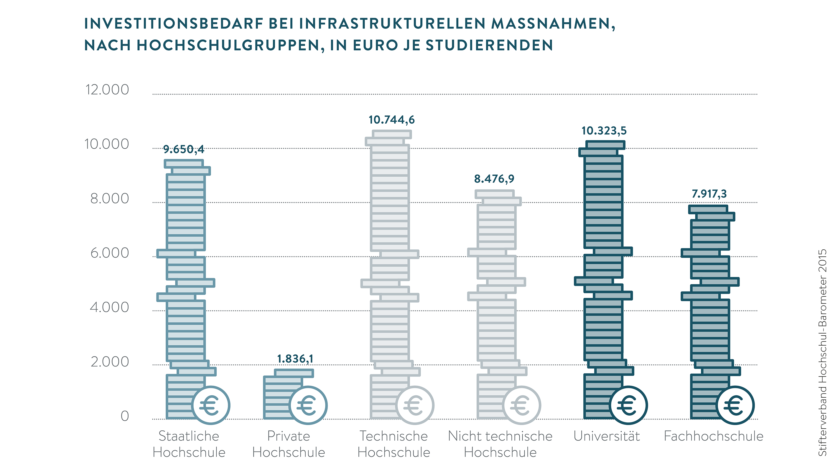 Nach Schätzung der Hochschulleiter müssten die Hochschulen mehr als 9.000 Euro je Studierenden aufwenden, um nicht getätigte Investitionen, zum Beispiel bei Gebäuden, Laboren und Technik, nachzuholen. Diese Investitionslücke ist bei staatlichen Hochschulen rund fünfmal so hoch wie bei privaten Einrichtungen. Auch das Hochschulprofil spielt eine Rolle. Technische Hochschulen und Universitäten haben einen überdurchschnittlichen Nachholbedarf.