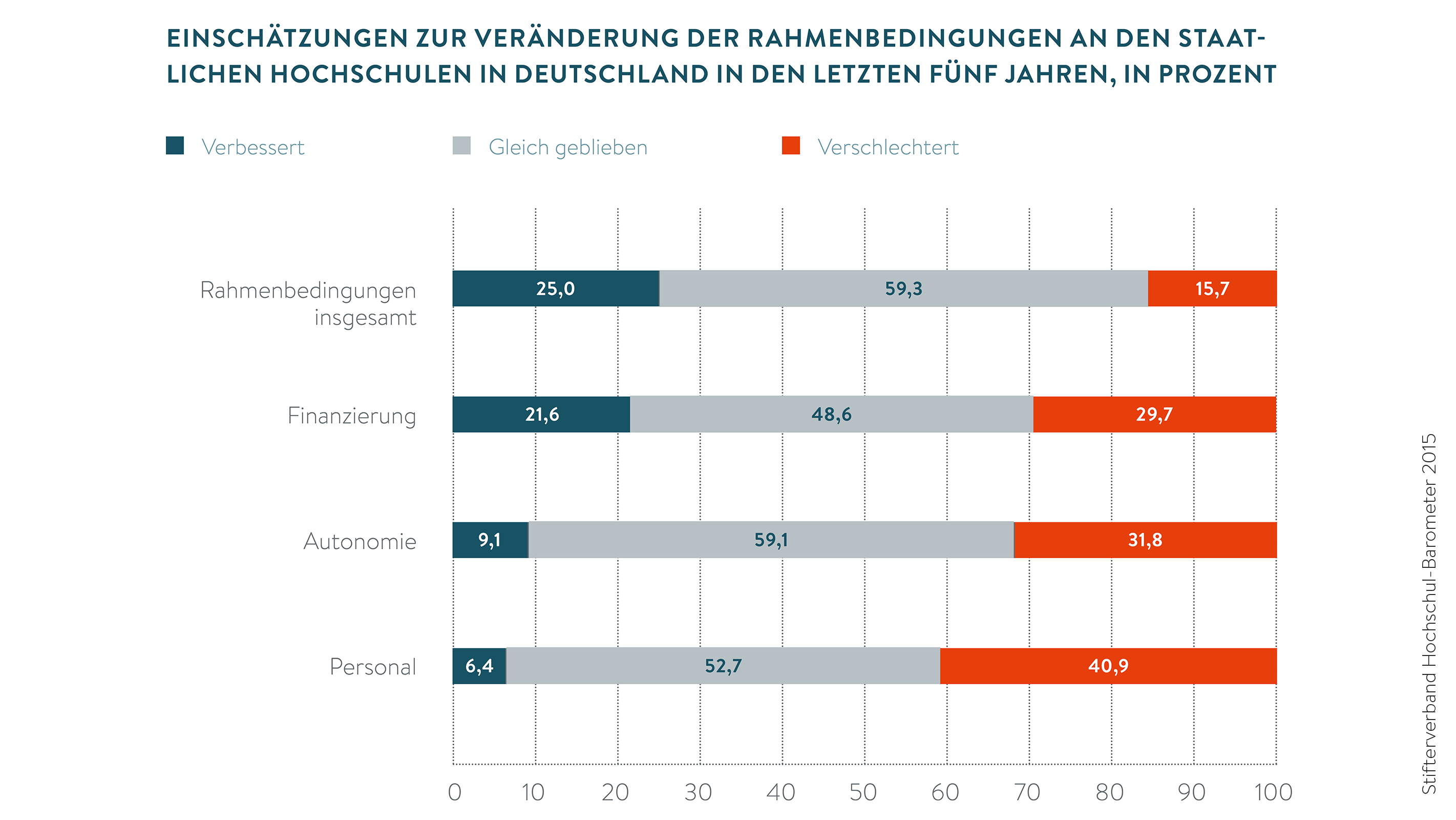 Eine Mehrheit der Rektoren und Präsidenten staatlicher Hochschulen sieht in den letzten fünf Jahren insgesamt nur wenig Veränderungen bei den Rahmenbedingungen. 25 Prozent sehen eine Verbesserung, 15,7 Prozent eine Verschlechterung. Allerdings wird die Entwicklung einzelner Bereiche kritisch bewertet. Hochschulleiter sehen heute eher weniger finanzielle Handlungsspielräume und mehr Herausforderungen bei der Personalsituation als vor fünf Jahren.