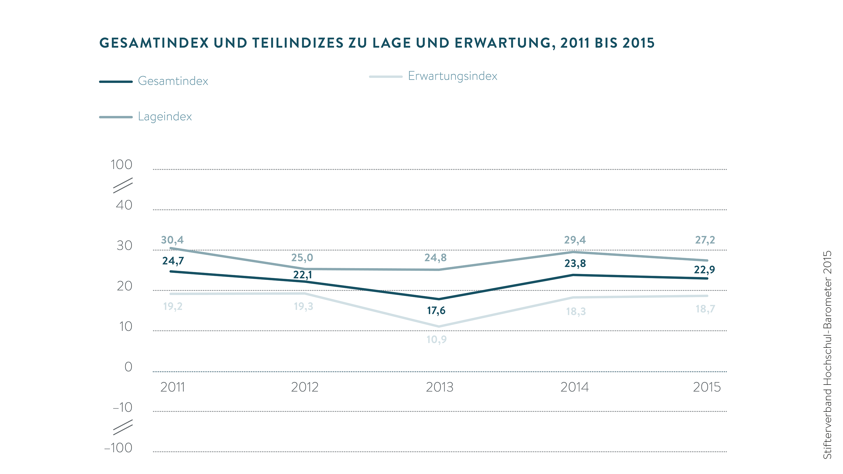 Die Stimmung an den Hochschulen zeigt sich gegenüber dem Vorjahr kaum verändert. Der Gesamtindex, der die Urteile der Hochschulleiter über die aktuelle und erwartete Situation ihrer Hochschule wiedergibt, fällt nur leicht und liegt aktuell bei 22,9 Punkten auf einer Skala von –100 bis +100 Punkten. Das Stimmungsmaß liegt damit leicht im positiven Bereich. Die Einschätzungen der aktuellen Situation sind dabei optimistischer als die Bewertung der zukünftigen Perspektiven – hier zeigen die Hochschulleiter gewöhnlich mehr Skepsis.