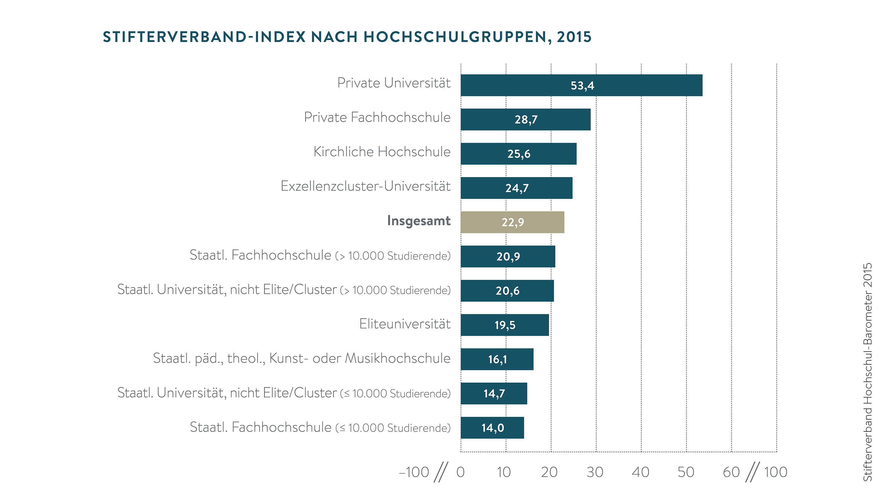 Gemessen am Stifterverband-Index ist die Einschätzung der Leitungen an privaten und kirchlichen Hochschulen deutlich besser als bei staatlichen Einrichtungen. Private Hochschulen sehen ihre Vorteile insbesondere bei den finanziellen und institutionellen Rahmenbedingungen sowie in der Lehre. Staatliche Hochschulen bewerten dagegen die Kooperation mit Partnern sowie die Wettbewerbsfähigkeit in der Forschung besser. Innerhalb der Gruppe staatlicher Hochschulen bewerten die Universitäten, die mit einem Exzellenzcluster in der Exzellenzinitiative des Bundes gefördert werden, ihre aktuelle und zukünftige Situation am besten. Kleine staatliche Fachhochschulen sind am wenigsten zufrieden. Die Unterschiede nach Trägerschaft sind dabei deutlich größer als nach Hochschulgröße oder Hochschultyp.