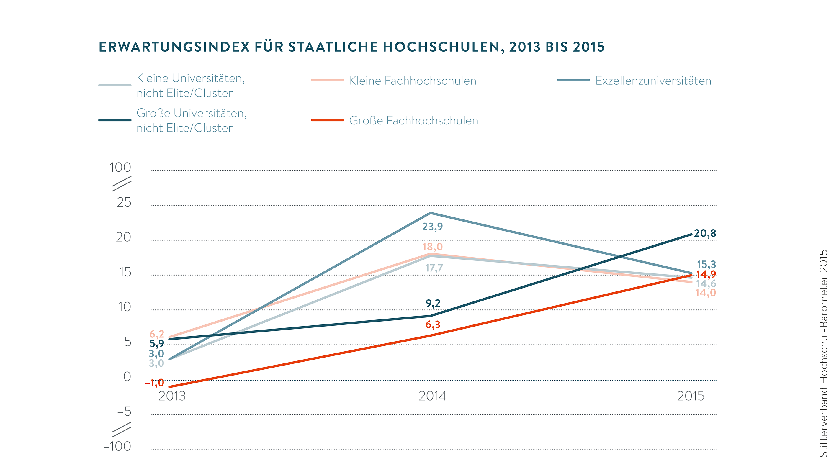Über alle Hochschulen hinweg sind die Erwartungen der Rektoren und Präsidenten gegenüber dem Vorjahr nahezu unverändert. Je nach Größe und Art der Hochschule entwickeln sich die Aussichten aber unterschiedlich. Mehr Zuversicht zeigen die großen staatlichen Hochschulen mit mehr als 10.000 Studierenden. Eine Ausnahme bilden Universitäten, die aktuell in der Exzellenzinitiative gefördert werden. Ihre Erwartungen haben einen Dämpfer erlitten. Die Ankündigung der Politik, die Exzellenzinitiative fortzuführen, hatte im Jahr 2014 offensichtlich Erwartungen geweckt, die durch die konkrete Ausgestaltung, die sich 2015 abzeichnete, nicht ganz erfüllt wurden.