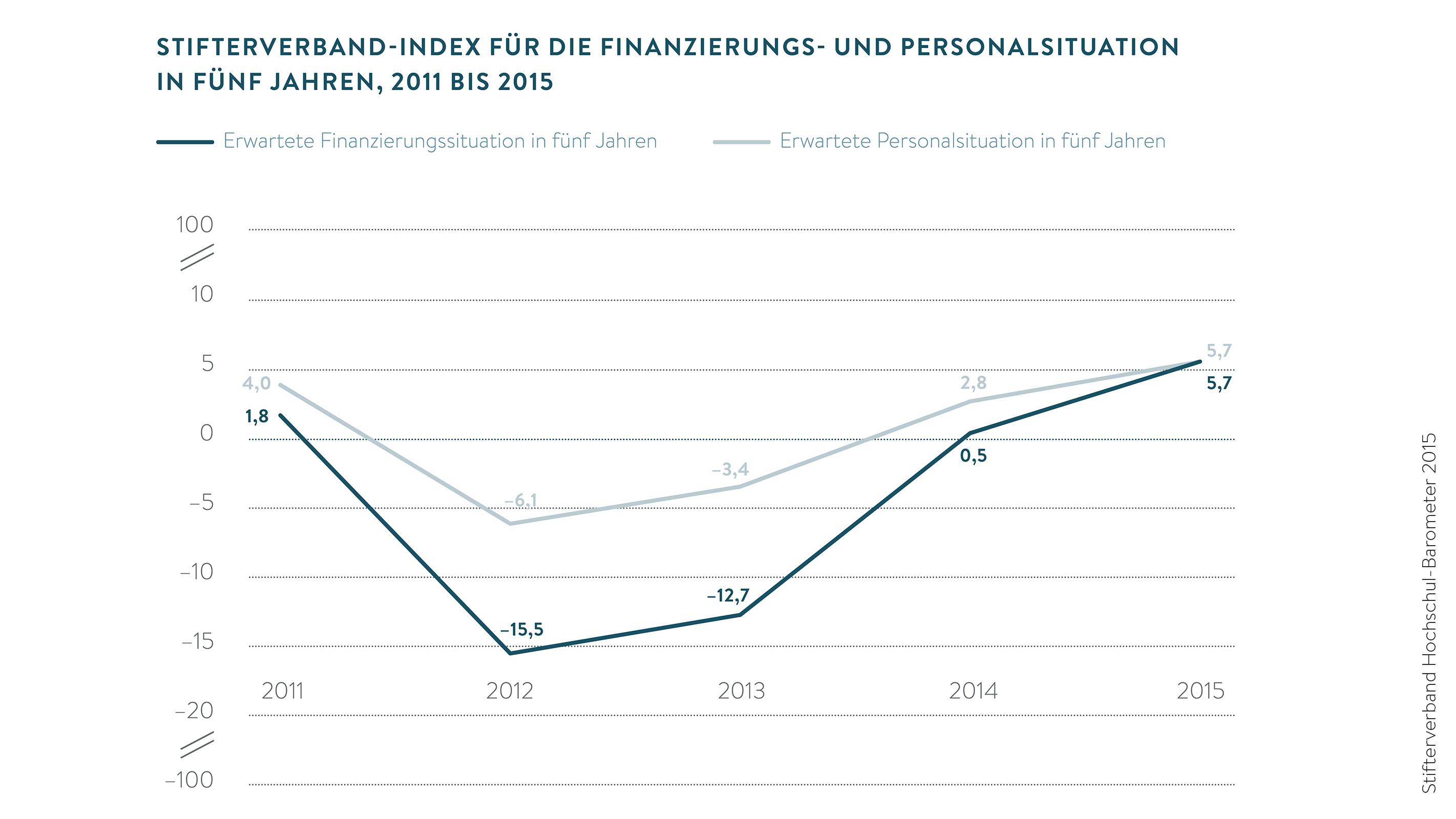 Seit fünf Jahren sehen die Hochschulleiter die zukünftige Finanzierungs- und Personalsituation kritisch. Die Rahmenbedingungen für beides gehören kontinuierlich zu den am schlechtesten bewerteten Indikatoren. Doch nach einem Tiefpunkt im Jahr 2012 ist die Hoffnung auf Verbesserung kontinuierlich gewachsen. Inzwischen erwartet eine knappe Mehrheit, dass sich mehr finanzielle und personelle Spielräume in den nächsten fünf Jahren ergeben.