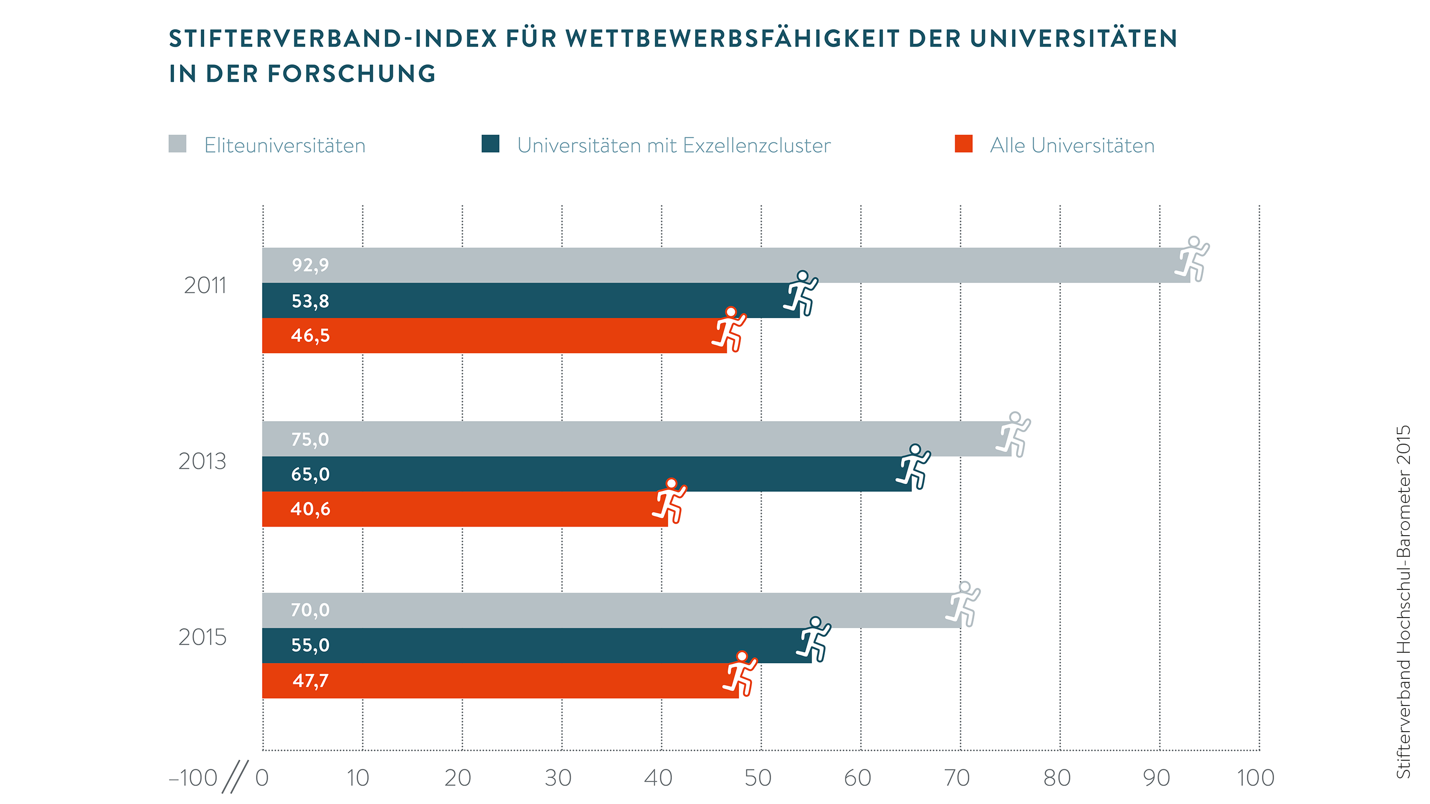 Hochschulen, die in der Exzellenzinitiative des Bundes aktuell gefördert werden, bewerten ihre Wettbewerbsfähigkeit in der Forschung höher als andere Universitäten. Das gilt insbesondere für die sogenannten Eliteuniversitäten. Allerdings nimmt der Vorsprung ab. Im Jahr 2011 haben fast alle Rektoren und Präsidenten von Eliteuniversitäten die Wettbewerbsfähigkeit als sehr hoch eingeschätzt. Dieser Anteil ist seitdem rückläufig und liegt nun näher am Durchschnitt aller Universitäten. Andere Universitätsleiter sehen die Forschungsstärke über die Zeit eher gleichbleibend hoch.
