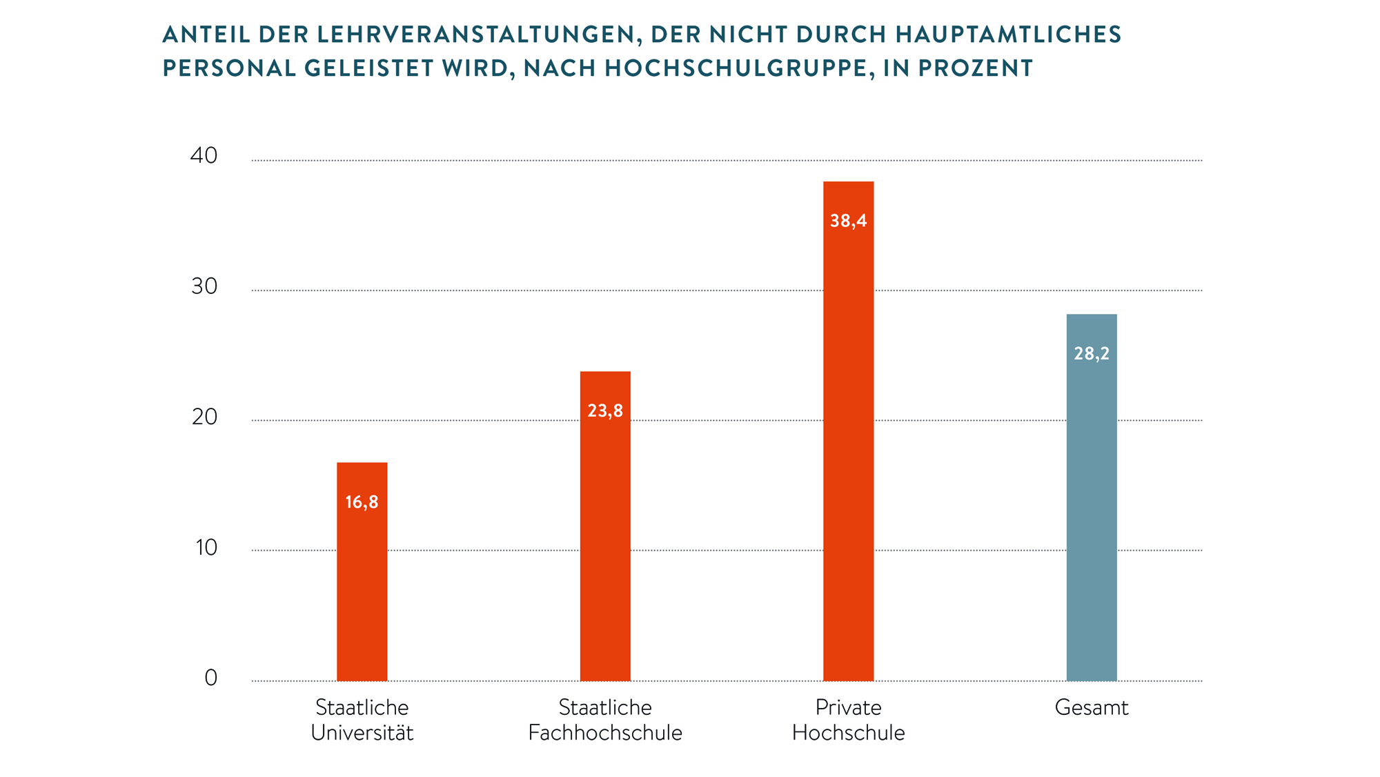 Außerordentliche Professoren, Lehrbeauftragte, Gastdozenten: Hochschulen nutzen vielfältige Möglichkeiten, Personen von außerhalb der Hochschulen in die Lehre einzubinden. Das kann befruchtend sein, wenn Perspektiven etwa aus der Wirtschaft oder dem Ausland in das Curriculum eingebunden werden. Das kann aber auch bedeuten, dass die eigenen Personalkapazitäten nicht ausreichen, um Pflichtveranstaltungen ordnungsgemäß anbieten zu können. Im Durchschnitt wird mehr als jede vierte Lehrveranstaltung nicht von hauptamtlichen Mitarbeitern der Hochschulen übernommen. Private Hochschulen greifen dabei besonders häufig auf externes Personal zurück.
