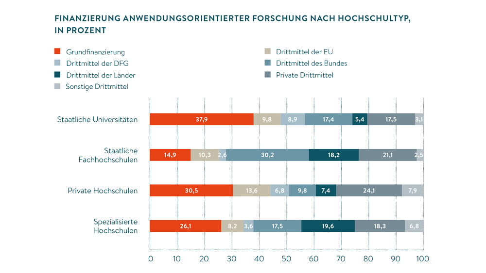 Anwendungsorientierte Forschung hat an Hochschulen überwiegend Projektcharakter. Nur rund ein Viertel der notwendigen Finanzierung wird über Grundmittel abgedeckt. Bei staatlichen Universitäten liegt der Anteil mit rund 38 Prozent allerdings mehr als doppelt so hoch wie bei Fachhochschulen (rund 15 Prozent), die allerdings auch insgesamt weniger Grundmittel für Forschung erhalten. Fast die Hälfte der Finanzmittel stammt aus Programmen des Bundes, der Bundesländer, der Europäischen Union und der Deutschen Forschungsgemeinschaft. Private Drittmittel machen insgesamt nur rund ein Fünftel aus. Der Anteil variiert dabei zwischen 24,1 Prozent an privaten Hochschulen und 17,5 Prozent an staatlichen Universitäten.