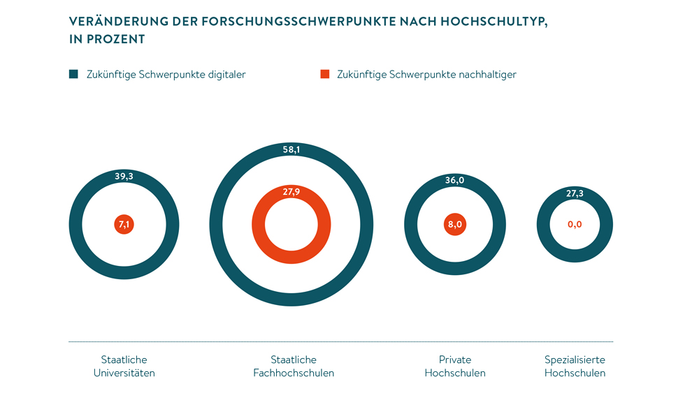Die zentralen gesellschaftlichen Trends Digitalisierung und Nachhaltigkeit beschreiben auch die zukünftigen Schwerpunktthemen der deutschen Hochschulforschung. Aus einer qualitativen Auswertung der Rückmeldungen der Hochschulleitungen zum jeweiligen Forschungsprofil ihrer Einrichtung lassen sich folgende Beobachtungen festmachen: Drei Viertel der befragten Hochschulen streben an, ihre Forschungsfelder in Zukunft weiter zu verändern. Vor allem staatliche Hochschulen wollen dabei verstärkt auf digitale Themen setzen. An rund jeder zweiten Hochschule werden Aspekte der Digitalisierung als Forschungsgegenstand an Bedeutung gewinnen. Aspekte der Nachhaltigkeit werden in rund jeder fünften Hochschule stärker berücksichtigt. Dabei orientieren sich Fachhochschulen stärker an diesen beiden Megatrends. Universitäten sind mit ihrem breiteren Fächerspektrum diverser aufgestellt.