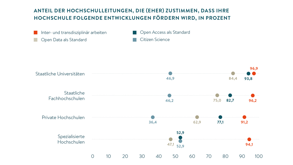 Die strategische Öffnung von Forschungs- und Innovationsprozessen hat das Potenzial, durch gesellschaftliche Beteiligung Vertrauen zu schaffen. Durch das Teilen von Forschungsergebnissen kann zudem die Schaffung neuen Wissens und neuer Anwendungen beschleunigt werden. Die Hochschulleitungen erkennen eine stark zunehmende Relevanz des Themas für die Zukunft. 95 Prozent wollen das trans- und interdisziplinäre Arbeiten ausbauen. Auch der verstärkte öffentliche Zugang zu Publikationen und Daten wird von einer großen Mehrheit befürwortet. Die Einbeziehung von Bürgern in Forschung (Citizen Science) will dagegen nur rund jede zweite Hochschulleitung befördern.