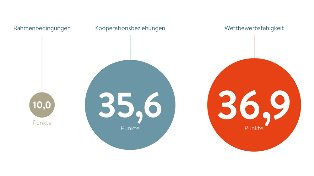 Die Hochschulen bewerten für den Stifterverband-Index ihre Rahmenbedingungen, ihre Kooperationsbeziehungen und ihre Wettbewerbsfähigkeit. Mit der Wettbewerbsfähigkeit und den Kooperationsbeziehungen sind die Hochschulen weitgehend zufrieden. Beide Bereiche liegen bei mehr als 30 Punkten auf einer Skala von -100 bis +100 Punkten. Die Einschätzung der allgemeinen Rahmenbedingungen fällt dagegen mit 10 Punkten nüchtern aus. Der Index hierzu setzt sich aus vier Teilindikatoren zusammen. Dabei beurteilen die Hochschulleitungen ihre Autonomie (28,1 Punkte) und Ausstattung (18,9 Punkte) deutlich besser als die Finanzierungs- (-1,6 Punkte) und Personalsituation (-5,3 Punkte).