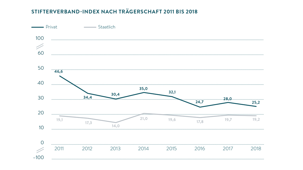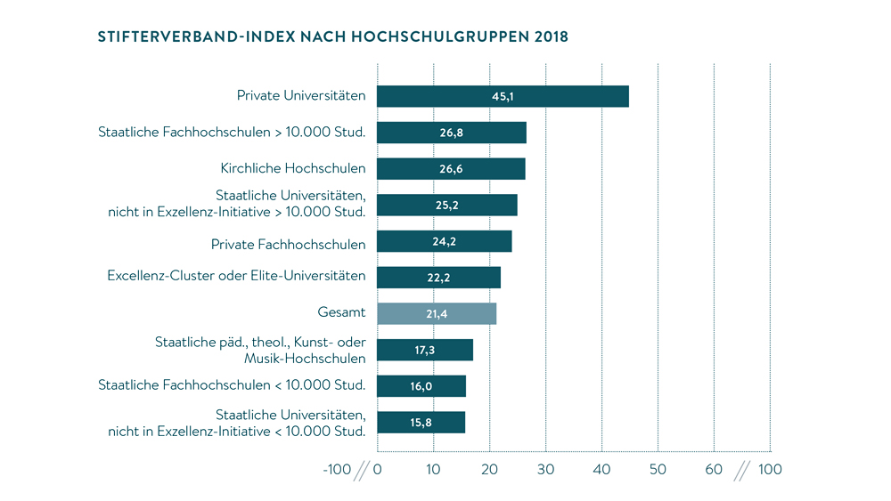 Die Leitungen privater Hochschulen sind im Durchschnitt insgesamt zufriedener als diejenigen von staatlichen Hochschulen. Ausschlaggebend ist die deutlich bessere Einschätzung der Rahmenbedingungen (Autonomie, Personalsituation, Ausstattung und Finanzierung). Mit den Außenbeziehungen und der Wettbewerbsfähigkeit sind dagegen staatliche Hochschulen deutlich zufriedener. Der Vorsprung der privaten Hochschulen in der Gesamteinschätzung ist in den vergangenen Jahren deutlich kleiner geworden. Während die Einschätzung der staatlichen Hochschulen recht konstant geblieben ist, sank die Zufriedenheit der privaten Hochschulen von 2011 bis 2018 von anfänglich 46 auf 25 Punkte. Trotz anscheinend rückläufiger Stimmung im privaten Hochschulsektor nahm die Zahl der nicht-staatlichen Bildungsanbieter in dieser Zeit um etwa ein Drittel zu.