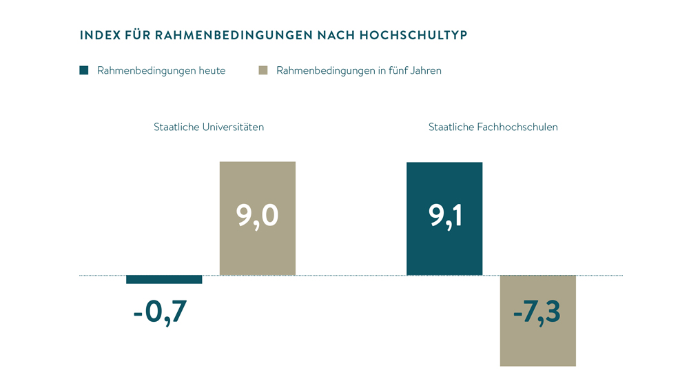 Große Zufriedenheit oder Zuversicht weisen weder staatliche Fachhochschulen noch staatliche Universitäten bei den Rahmenbedingungen auf. Doch es gibt Unterschiede: Die staatlichen Universitäten