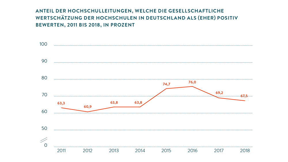 Insgesamt sehen Hochschulen eine hohe gesellschaftliche Akzeptanz ihrer Arbeit. Zwei Drittel der Hochschulleitungen beurteilt die gesellschaftliche Wertschätzung als gut oder eher gut. Allerdings sinkt diese Einschätzung der Hochschulleitungen im zweiten Jahr in Folge. Zwischen 2011 und 2016 hatte sich hingegen, aus Sicht der Hochschulen, die gesellschaftliche Wertschätzung der wissenschaftlichen Institutionen immer weiter verbessert. Die Hochschulen selbst können viel für eine positive Wahrnehmung leisten. Dazu tragen eine relevante Forschung und eine hohe Qualität der Ausbildung bei. Aber auch der offene Dialog, gemeinsame Forschungsprojekte (zum Beispiel Citizen Science) und das Engagement für die Lösung sozialer und technologischer Herausforderungen stärken die Wahrnehmung der Hochschule als wichtigen gesellschaftlichen Akteur.