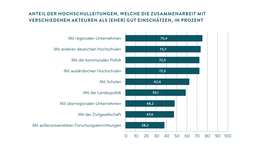In Bezug auf die Bereitschaft zur Kooperation und zum Dialog mit anderen Akteuren schätzen Hochschulleitungen die Zusammenarbeit mit Unternehmen aus der Region am besten ein. Die Zusammenarbeit mit der Politik auf kommunaler Ebene steht an zweiter Stelle. Hier besteht ein deutlicher Unterschied zwischen staatlichen und privaten Hochschulen. Staatliche Hochschulen bewerten außerdem die Kooperation mit anderen deutschen Hochschulen positiver als private. Private und nicht-technische Hochschulen sind eher als andere Hochschulen mit der Zusammenarbeit mit gesellschaftlichen Akteuren zufrieden. Die Zusammenarbeit mit Unternehmen außerhalb der Region, Organisationen der Zivilgesellschaft und vor allem außeruniversitären Forschungseinrichtungen
