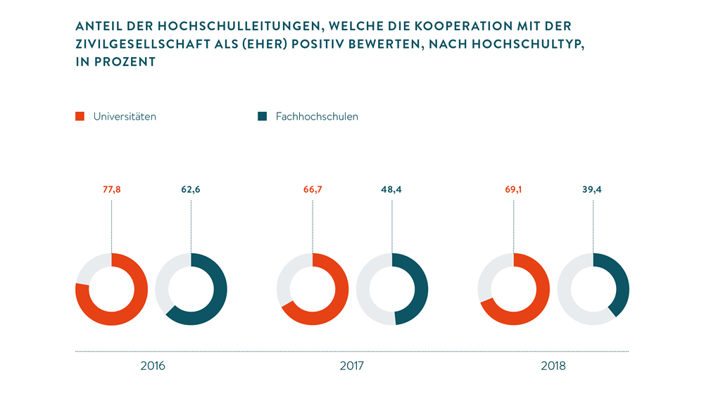 Die Hochschulen sind mit der Zusammenarbeit mit zivilgesellschaftlichen Partnern tendenziell weniger zufrieden als mit Kooperationen mit Unternehmen. Mit Blick auf systemische Innovationsprozesse und wachsende Beteiligungswünsche aus der Gesellschaft steigt jedoch die Bedeutung einer Einbindung auch zivilgesellschaftlicher Akteure in die Aktivitäten der Hochschulen. Zwischen Universitäten und Fachhochschulen fallen große Unterschiede in der Bewertung dieser Kooperationen auf. Universitäten bewerten sie zu 69,1 Prozent als (eher) positiv. Bei Fachhochschulen sind es nur 39,4 Prozent. Für Fachhochschulen, die häufig schwerpunktmäßig technische und wirtschaftswissenschaftliche Fächer anbieten, scheint die Zusammenarbeit mit der Zivilgesellschaft eher herausfordernd zu sein.