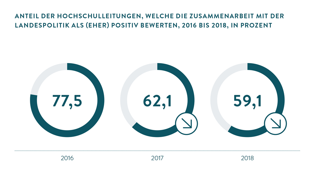 Die Bundespolitik gewinnt an Einfluss auf die Hochschulen. Insbesondere über Förderprogramme stößt sie neue Entwicklungen an. Bereits 2014 wurden die gesetzlichen Regelungen für eine engere Zusammenarbeit zwischen Bund und Ländern im Wissenschaftsbereich geschaffen. Viele Initiativen steuern und finanzieren die beiden politischen Ebenen nun gemeinsam. Dennoch bleibt die Landespolitik erster Ansprechpartner der Hochschulen. Sie verhandelt die Zielvereinbarungen, definiert die Aufgaben der Hochschulen und gewährt die Grundfinanzierung. Insgesamt ist die Zufriedenheit mit der Zusammenarbeit mit der Landespolitik in den vergangenen beiden Jahren rückläufig. Waren 2016 noch über drei Viertel der Hochschulleitungen mit der Zusammenarbeit zufrieden, sind es 2018