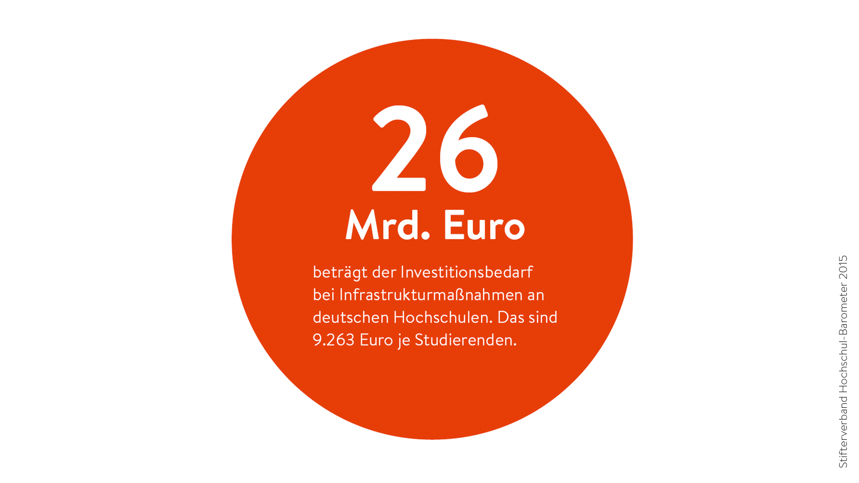 Die Hochschulen melden einen hohen Nachholbedarf bei Infrastrukturmaßnahmen. Die aus der Befragung durch Hochrechnung ermittelte Investitionslücke beträgt rund 26 Milliarden Euro. Ermittelt wurde dabei die Summe, die aus Sicht der Rektoren und Präsidenten notwendig ist, um eine angemessene Ausstattung für die aktuellen Aufgaben in Forschung und Lehre zu gewährleisten. Dazu zählen der Neuerwerb und die Instandhaltung von Gebäuden, Lehrmaterial und Bibliotheken, IT-Infrastruktur, Labore und Forschungsgeräte.