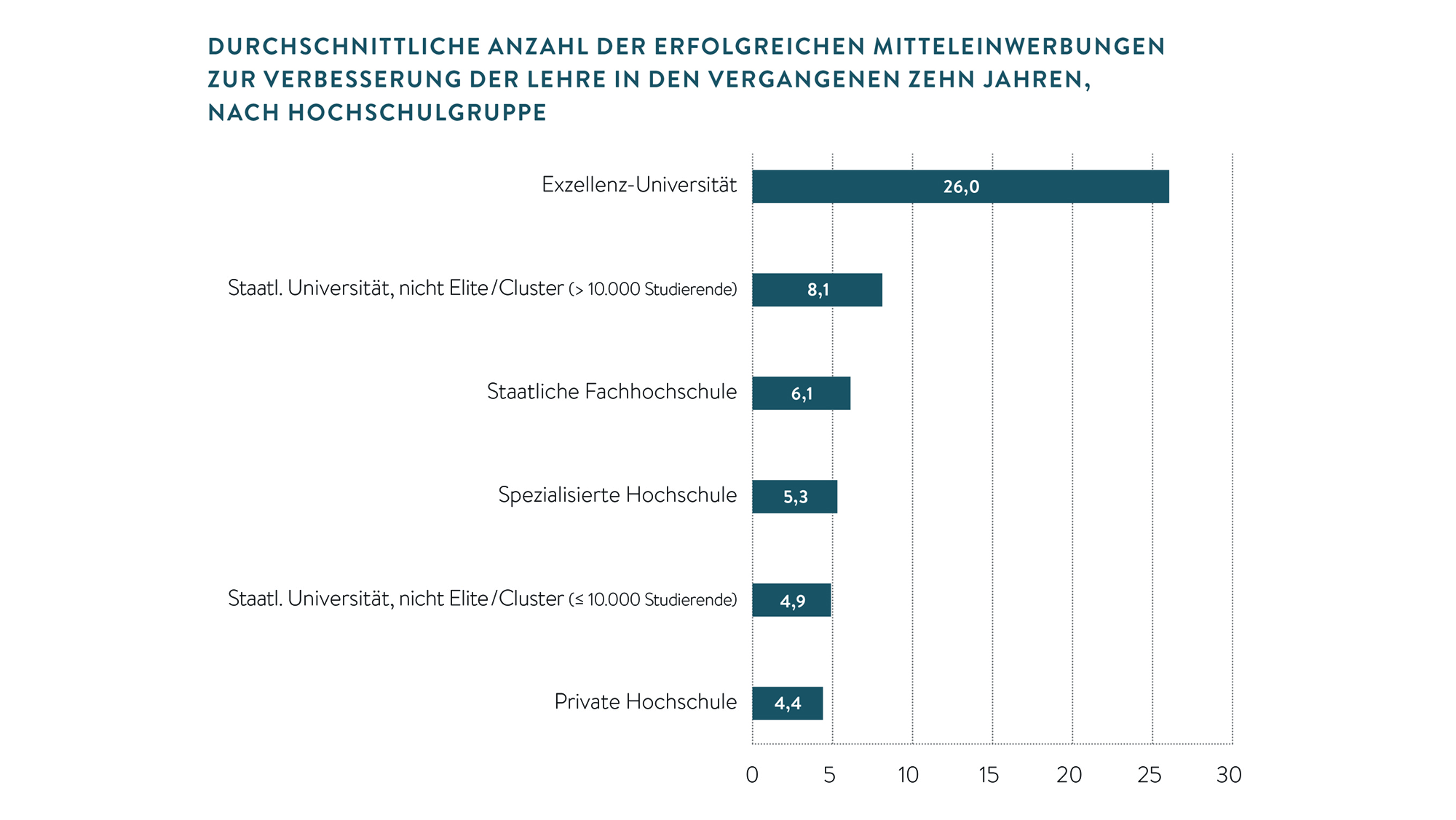 Bund und Länder haben zahlreiche Initiativen entwickelt mit dem Ziel, die Qualität der Lehre zu verbessern. Laut Befragung haben staatliche Universitäten in den vergangenen zehn Jahren zweimal mehr entsprechende Förderanträge bewilligt bekommen als staatliche Fachhochschulen. Besonders erfolgreich waren Eliteuniversitäten und Universitäten mit Exzellenzclustern. Damit liegen jene Hochschulen vorne, die bereits eine hohe Forschungsförderung erhalten. Eine Profilbildung einzelner Hochschulen in Lehr- oder Forschungsexzellenz scheint sich hier also nicht abzuzeichnen. Auch der Bundesländervergleich zeigt Unterschiede: Hessen, Baden-Württemberg und Brandenburg waren laut Befragung in der Einwerbung von Drittmitteln für Lehre besonders erfolgreich.
