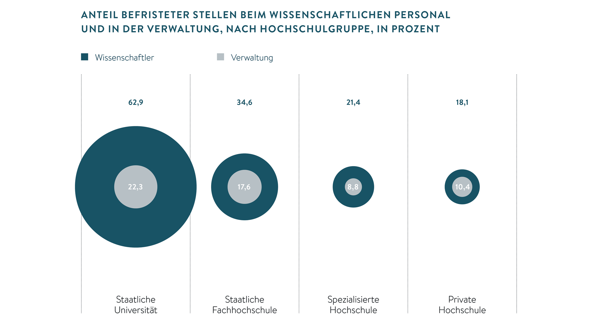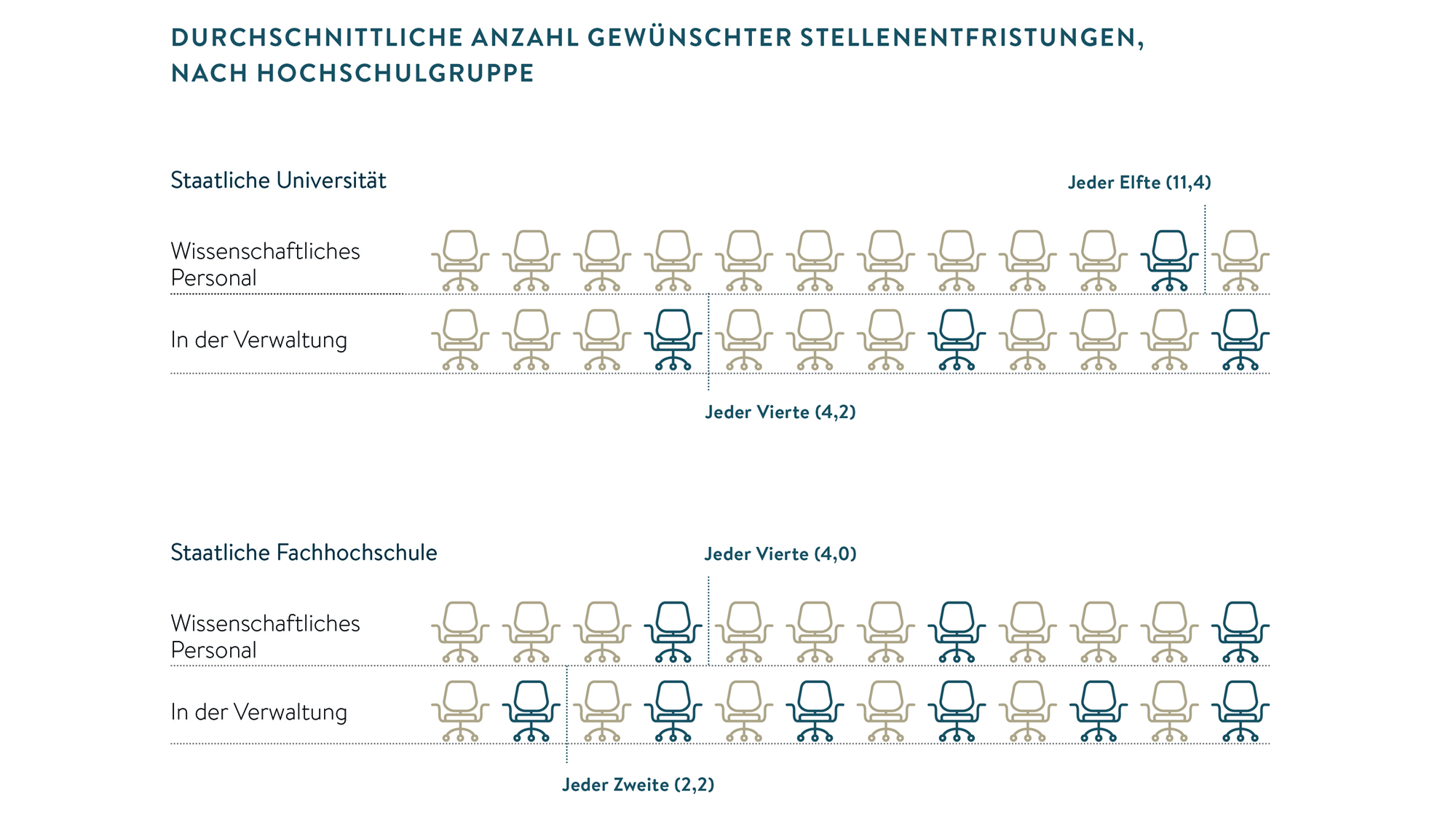 Den bestehenden Anteil an Zeitverträgen bewerten die Hochschulleiter von privaten sowie spezialisierten Hochschulen als weitgehend adäquat. Allerdings arbeiten dort nur rund jeder fünfte Wissenschaftler und ein Zehntel der Verwaltung befristet. Staatliche Universitäten sehen bei einer großen Anzahl an Qualifizierungs- und Drittmittelstellen nur begrenzten Spielraum für eine Senkung der befristeten Beschäftigung. So wollen die Universitätsleiter den hohen Anteil der befristeten Verträge beim wissenschaftlichen Personal um 5,5 Prozentpunkte auf 57,4 Prozent senken. Das entspricht einer Entfristung jeder elften Stelle. Die Leiter von Fachhochschulen wollen sogar jede vierte Stelle entfristen. In der Verwaltung liegen die entsprechenden Werte noch höher.