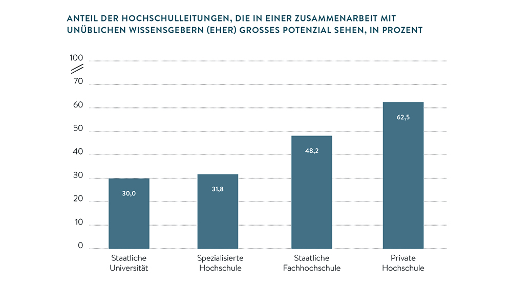 Die Zusammenarbeit von Wissenschaft mit unüblichen Wissensgebern, wie Bürgern, Betroffenen, Internetnutzern oder auch fachfremden Wissenschaftlern, kann zu neuen Forschungsfragen und -themen führen. Doch das entsprechende Potenzial schätzt nicht einmal jede zweite Hochschulleitung als groß ein. Noch skeptischer sind die Präsidenten und Rektoren von staatlichen Universitäten und spezialisierten Hochschulen. Hier ist weniger als jeder Dritte von den Chancen einer Einbindung neuer Akteure in den Forschungsprozess überzeugt. Private Hochschulen und traditionell praxisnahe Fachhochschulen sehen in der Zusammenarbeit mit unüblichen Wissensgebern dagegen größere Potenziale.