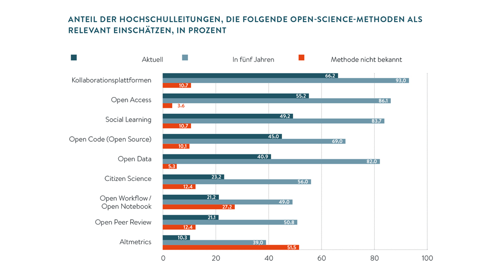 Die unterschiedlichen Open-Science-Ansätze sind für die Hochschulen nicht gleichermaßen relevant. Den größten Zuspruch von 66,2 Prozent erfahren Plattformen, die eine Zusammenarbeit mit Akteuren aus Wissenschaft und Innovation organisieren. Es folgen Konzepte für Offenheit beim Zugang zu Literatur, Programmierung und Daten sowie beim gemeinschaftsbasierten Lernen. Andere Formen der Open Science spielen derzeit eine geringere Rolle. Alternative Messgrößen für wissenschaftliche Leistung (beispielsweise Altmetrics) als Steuerungs- und Bewertungsinstrument für Open Science sind zudem nur knapp jeder zweiten Hochschulleitung bekannt. Einigkeit besteht jedoch darin, dass die unterschiedlichen Instrumente in den kommenden fünf Jahren wichtiger werden. Den größten Zuwachs an Relevanz sehen die Leitungen beim Thema Open Data.