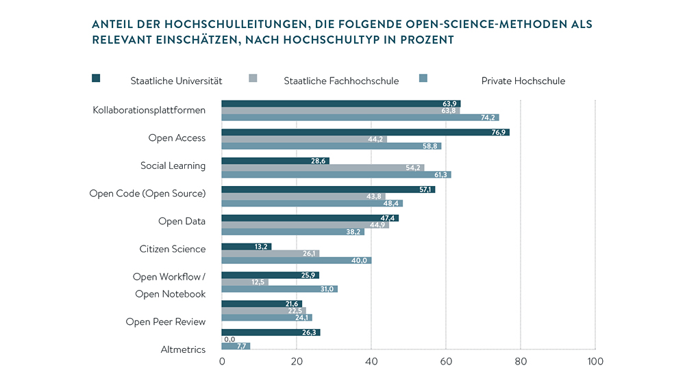 Die Einschätzungen zur Relevanz von Open-Science-Methoden unterscheiden sich deutlich nach Hochschultyp. Für 76,9 Prozent der Leitungen staatlicher Universitäten stellt Open Access heute ein hoch relevantes Thema dar. An Fachhochschulen sagen dies nur 44,2 Prozent. Auch das Thema Open Source ist für Universitäten relevanter als für die anderen Hochschultypen. Soziale Lehr- und Lernkonzepte wie Social Learning und Citizen Science spielen dagegen eher an staatlichen Fachhochschulen und privaten Hochschulen eine wichtige Rolle. Das höchste Potenzial schreiben die Leitungen dieser beiden Hochschultypen allerdings den kollaborativen Plattformen und Instrumenten zu.