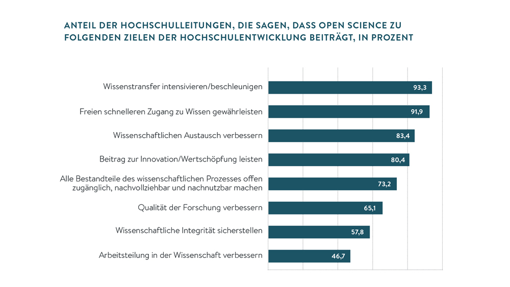 Was können Open-Science-Methoden konkret bewirken und auf welche Ziele der Hochschulentwicklung zahlen sie ein? Aus Sicht der Hochschulleitungen trägt Open Science vor allem zur Intensivierung des Wissenstransfers sowie zum freien und schnelleren Zugang zu Wissen bei. Diese Ziele erreichen jeweils mehr als 90 Prozent Zustimmung. Auch eine Verbesserung des Austauschs innerhalb der Wissenschaft und der Beitrag zu Innovation werden von mehr als 80 Prozent genannt. Knapp drei von vier Hochschulleitungen sind zudem davon überzeugt, dass Open Science Transparenz schafft und alle Bestandteile des wissenschaftlichen Prozesses offen zugänglich, nachvollziehbar und verwertbar machen soll. Weniger häufig werden innerwissenschaftliche Ziele genannt, wie Forschungsqualität verbessern, wissenschaftliche Integrität sicherstellen und Arbeitsteilung in der Wissenschaft vorantreiben.