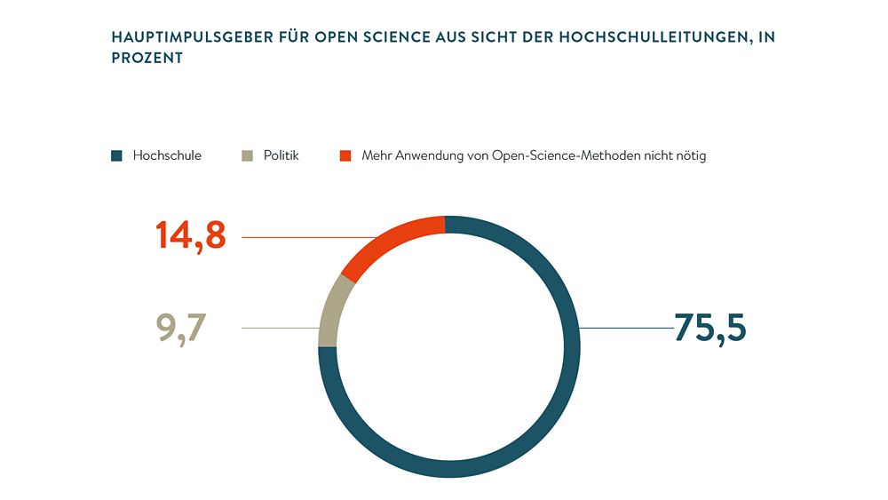 Mit der zunehmenden Digitalisierung und Komplexität gesellschaftlicher Prozesse gewinnt offene Wissenschaft an Bedeutung sowohl für die Akzeptanz von Forschung als auch für die Entwicklung des Innovationspotenzials. Etwa 20 Prozent aller innovierenden Unternehmen in Deutschland kooperieren heute mit externen Partnern. Der wichtigste Partner sind die Hochschulen. So braucht offene Innovation in der Wirtschaft transfer- und innovationsorientierte offene Wissenschaft. Insgesamt ist Open Science jedoch noch nicht breit an den Hochschulen verankert. Die Hochschulleitungen erkennen aber eine stark zunehmende Relevanz des Themas für die Zukunft.