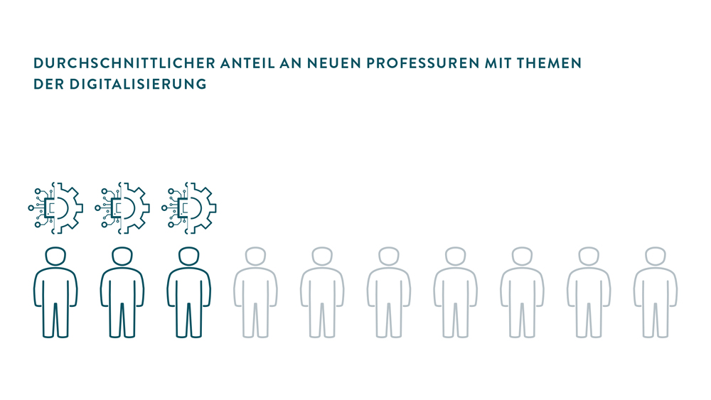 Hochschulen richten immer mehr Lehrstühle mit dem Schwerpunkt Digitalisierung ein, drei von zehn im Jahr 2018 neuberufenen Professuren beschäftigen sich laut den befragten Hochschulleitungen explizit mit Themen der Digitalisierung. Hochgerechnet sind dies – bei 2.000 bis 2.500 Neuberufungen insgesamt3 – zwischen 600 und 750 neue Professuren mit Digitalschwerpunkt. Dabei handelt es sich um Professuren aus allen Disziplinen wie zum Beispiel Digital Humanities, Digitalwirtschaft oder Big Data Analysis. Der Anteil an Professuren mit digitalen Arbeitsschwerpunkten ist an technischen Hochschulen etwas höher als an nicht-technischen (37 versus 27 Prozent). Außerdem haben staatliche Fachhochschulen (37 Prozent) einen höheren Anteil als staatliche Universitäten (30 Prozent).