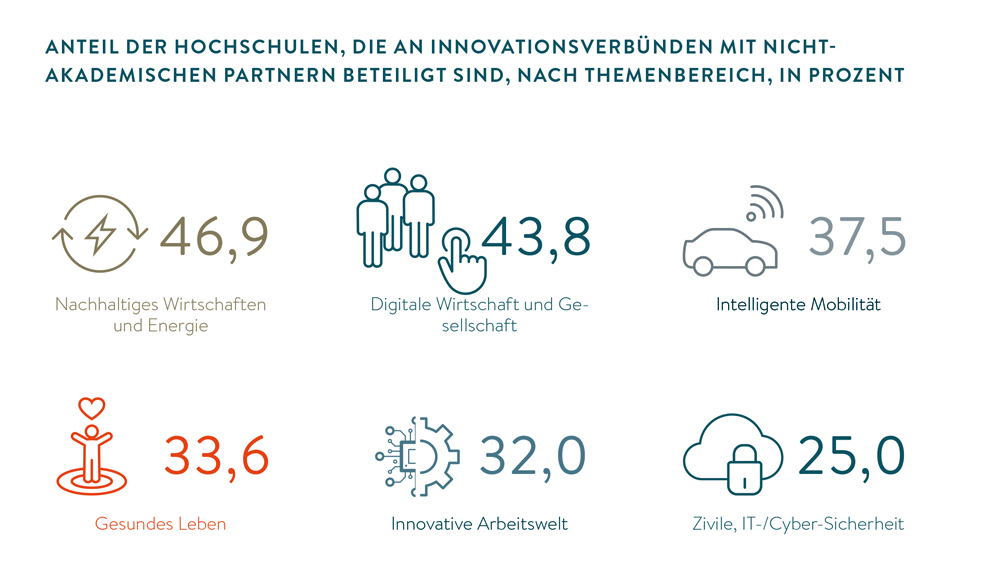 Der Innovationsfaktor Hochschule zeigt sich auch an der hohen Beteiligung der Hochschulen an Innovationsverbünden. Beispiele sind Cluster-Initiativen oder Industry-on-Campus-Modelle. Dort arbeiten Hochschulen gemeinsam mit Unternehmen, Politik und gesellschaftlichen Akteuren an übergreifenden Forschungsthemen. Durch diese Zusammenarbeit sind die Anwendung und Verwertung der Forschungsergebnisse gesichert. Mit Blick auf die Innovationsfelder der Hightech-Strategie der Bundesregierung beteiligen sich die Hochschulen am stärksten an Verbünden zu den Themen Nachhaltiges Wirtschaften und Energie sowie Digitale Wirtschaft und Gesellschaft. Staatliche Hochschulen, vor allem Universitäten, beteiligen sich hier deutlich häufiger als private oder spezialisierte Hochschulen.
