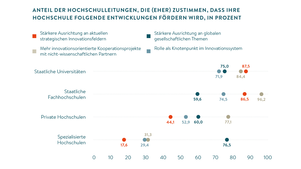 Die große Mehrheit der Hochschulleitungen befürwortet eine stärkere Orientierung ihrer Einrichtung an Innovationsthemen. Neben rein wissenschaftlichen Aspekten sollen demnach gesellschaftliche Aspekte eine wachsende Rolle in Forschung und Lehre spielen. Dafür wollen mehr als 80 Prozent enger mit gesellschaftlichen Partnern zusammenarbeiten. Rund zwei Drittel planen eine stärkere Ausrichtung an strategischen Innovationsfeldern, wie sie beispielsweise in der Hightech-Strategie der Bundesregierung benannt sind. Ebenso viele möchten ihre Forschung verstärkt an globalen gesellschaftlichen Themen orientieren, zum Beispiel an den Entwicklungszielen der Vereinten Nationen. Zudem möchte die Mehrheit der Hochschulleitungen ihre Einrichtung als regionalen Innovationshub ausbauen, um so eine Mittlerfunktion für unterschiedliche Innovationsakteure einzunehmen.