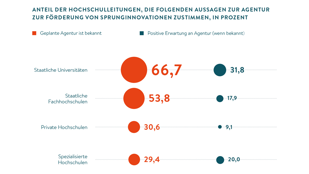 Im Sommer 2018 hat die Bundesregierung beschlossen, der Förderlandschaft für Forschung und Innovation ein völlig neues Element hinzuzufügen. Die neue Agentur zur Förderung von Sprunginnovationen soll Innovationen auf den Weg bringen, die technologisch radikal neu sind und ein hohes Potenzial für eine marktverändernde Wirkung haben. Trotz der zukünftig zentralen Rolle als Innovationsförderer kennt nur knapp die Hälfte der Hochschulleitungen die geplante Agentur. Davon wiederum erwartet nur jede fünfte mehr Innovationen für Deutschland. Es sind also noch große Anstrengungen notwendig, um die akademische Forschung für eine Mitwirkung an den Aktivitäten der Agentur zu