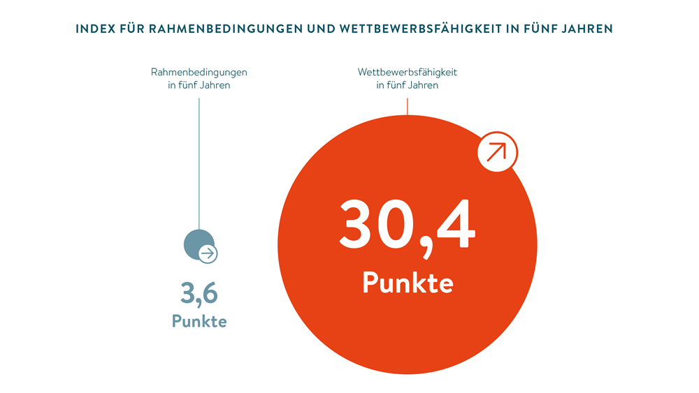 Die Hochschulleitungen bewerten die aktuellen Rahmenbedingungen kritisch und dennoch die Wettbewerbsfähigkeit ihrer eigenen Hochschule in Forschung und Lehre als sehr gut. Diese Diskrepanz wird laut Einschätzung der Rektoren und Präsidenten weiter steigen. Denn für die nächsten fünf Jahre erwarten sie kaum Veränderungen bei den Rahmenbedingungen. Der entsprechende Index liegt nahe bei null auf der Skala von -100 bis +100 Punkte. Für die Wettbewerbsfähigkeit werden dagegen weitere Verbesserungen erwartet.